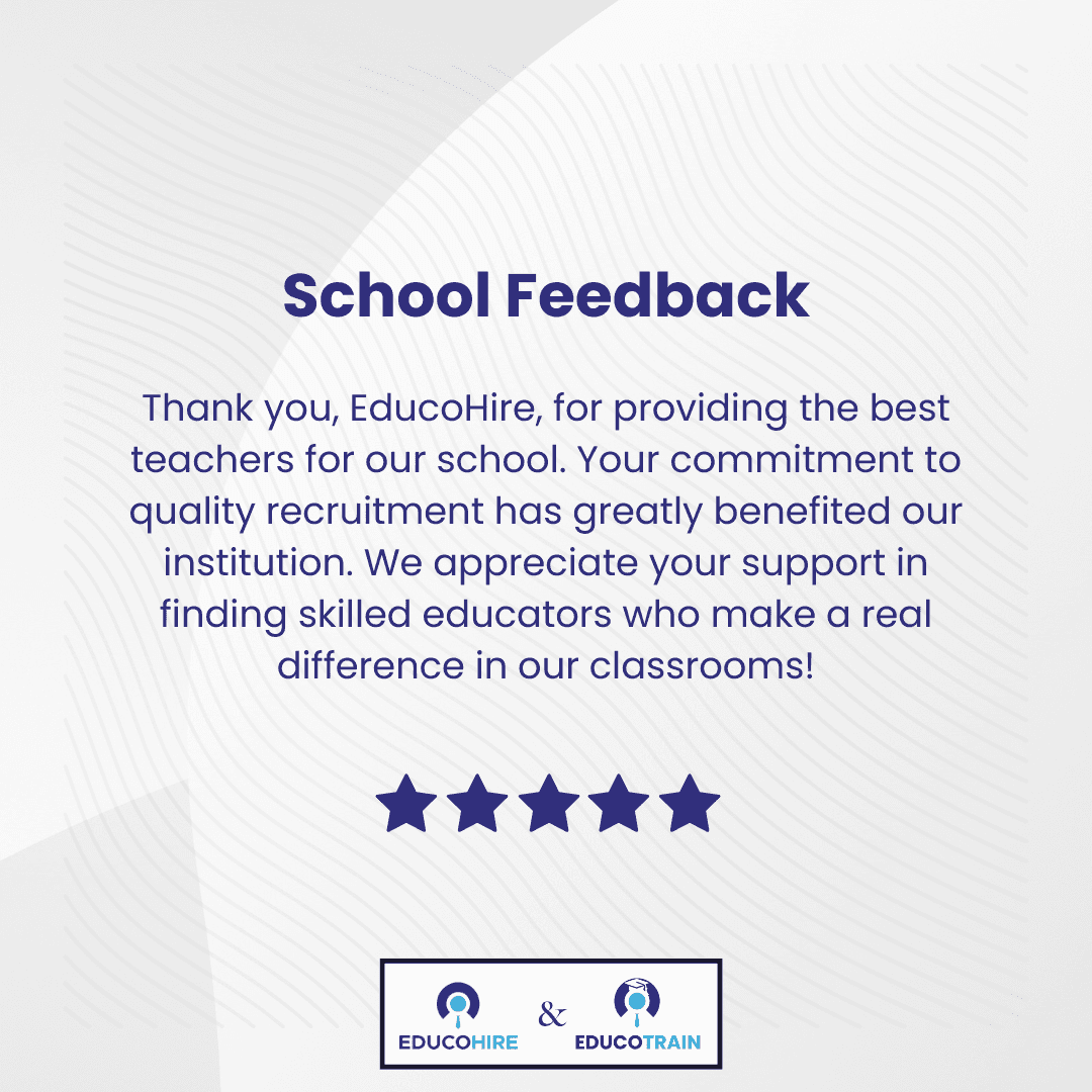 "Thank you, EducoHire, for connecting us with highly qualified teachers who have enriched our school community. Your dedication to quality recruitment has helped us find educators who truly inspire and make a lasting impact in our classrooms. We appreciate your continued support!"